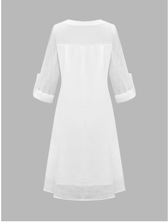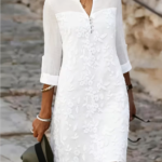VESTIDO ELEGANTE DE ENCAJE FLORAL A MEDIA RODILLA , CUELLO EN V , DOBLADILLO ACAMPANADO CON DISEÑO SOFISTICADO