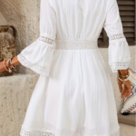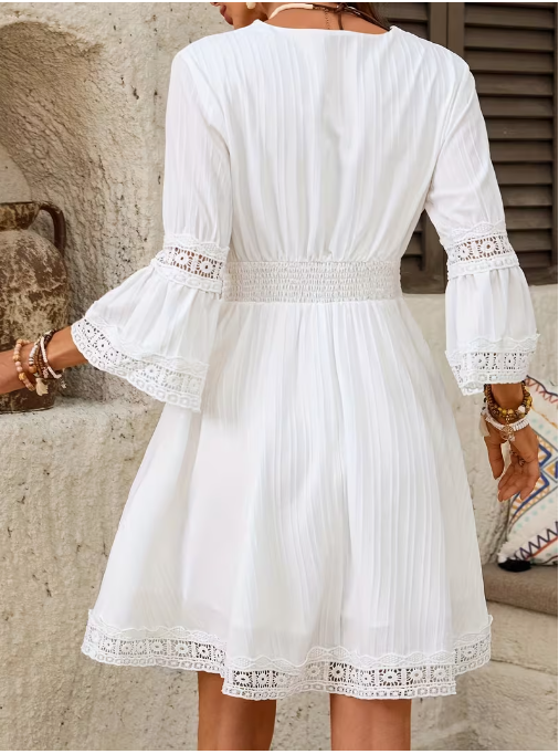 VESTIDO A MEDIA RODILLA BLANCO CON HERMOSOS APLIQUES DE ENCAJE Y CINTURILLA